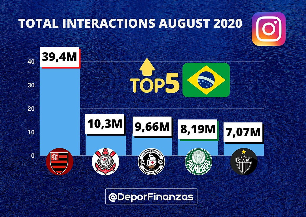 Deportes&Finanzas® @DeporFinanzas 📲⚽🇧🇷 Os 5 clubes brasileiros com mais engajamento no #instagram durante agosto 2020! 📉 Total interações 💙💬 1.@Flamengo 39,4M 2.@Corinthians 10,3M 3.@VascodaGama 9,66M 4.@Palmeiras 8,19M 5.@Atletico 7,07M